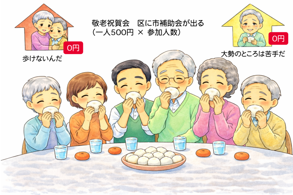 なった。敬老会や生き生きサロンに出席する人だけに500円/人が支給された。 公平な施策だろうか?